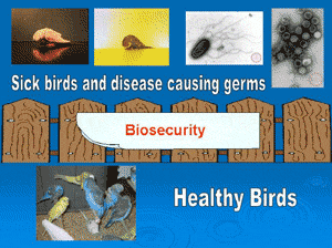 | What can we do to keep our birds safe? If we cannot see germs, how can we keep them away from our birds? Fortunately, we can practice something called biosecurity. Practicing biosecurity means doing everything we can to keep germs away from our birds. Let's look at some biosecurity practices below: |
