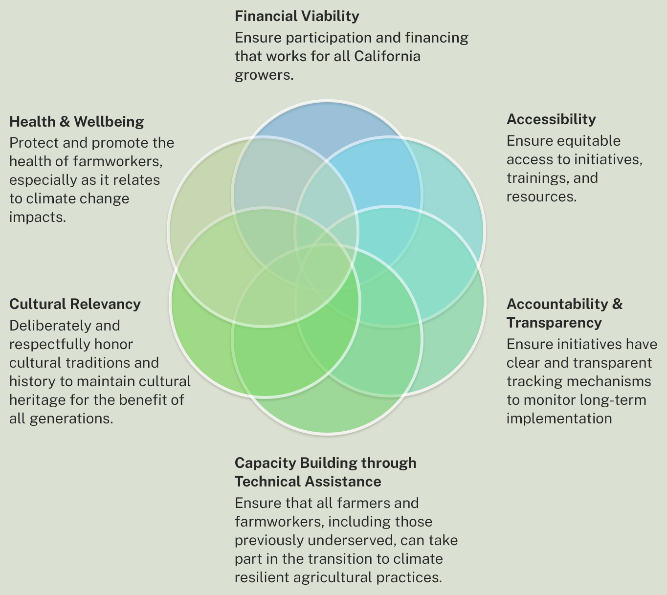 The Equity Principles were developed to help CDFA and partner agencies evaluate and improve initiatives, such as program design, policy development, and plan implementation. These six principles ensure that agencies serve all farmers, ranchers, and land stewards by providing a consistent set of guiding concepts to embed within plans, programs, policy development, and implementation to ensure access for all scales, crops, and types of agricultural businesses in California.