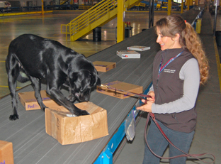 Cosmo ‘alerted’ and led Lisa right to the package on a top shelf in a loaded delivery truck, letting Lisa know that it contained an agricultural commodity. Cosmo ‘alerts‘ by scratching on a package if he has direct access to it, or as in this case when the package is out of reach, by trying to reach the package by stretching towards it.